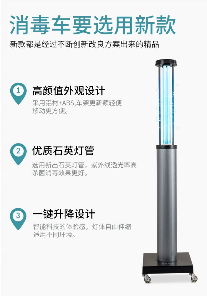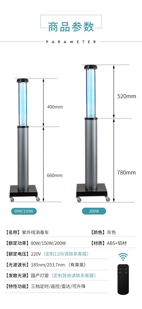 產(chǎn)品名稱:移動(dòng)式升降紫外線消毒車 產(chǎn)品消毒時(shí)間可以通過(guò)遙控定時(shí)設(shè)計(jì),帶有雷達(dá)保護(hù)功能 產(chǎn)品可以選擇有臭氧或者無(wú)臭氧 產(chǎn)品采用中性包裝。