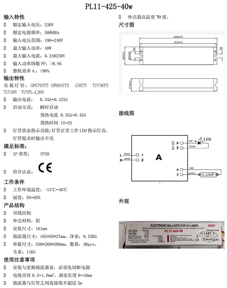 輸入電壓:220V 輸出電流:425mA 功率:20-40W 配套燈管:直管或者H管、U管 出線:2兩線輸入,四線輸出。 帶LED指示燈。 類型:IC控制電子鎮(zhèn)流器。 材料:鋁材外殼。